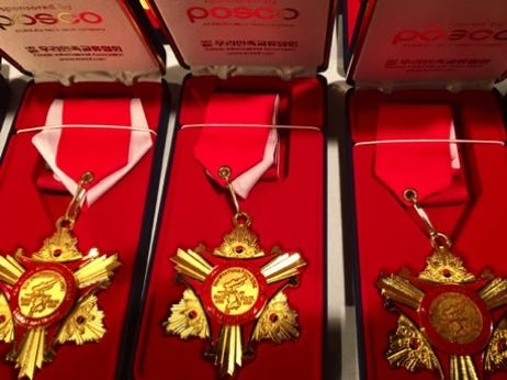 The Ambassador, who created the medal, says they are made from melted down barbed wire separating North and South Korea.