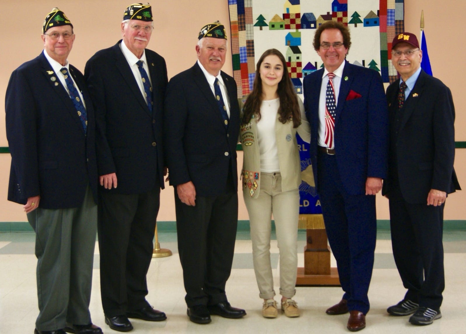 L-R: Ken, Roger, Art, Skip, Assist. Scout Leader & Knights of Columbus Grand Knight Steve Leslie, Eagle Scout Ben Liebman, Mayor Carolyn Mirek, State Rep. Tom Denicki.