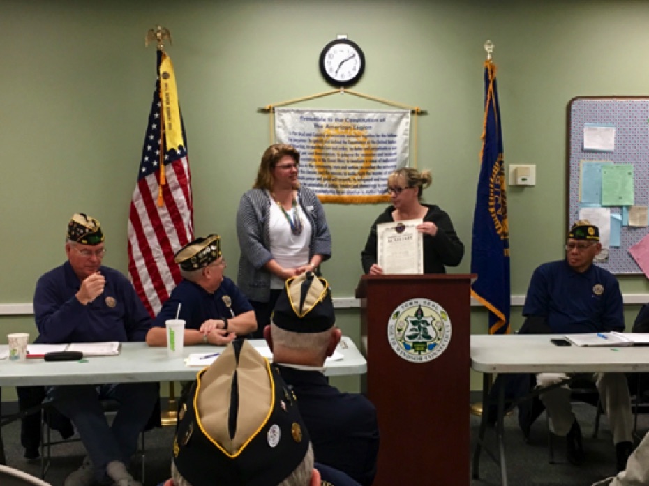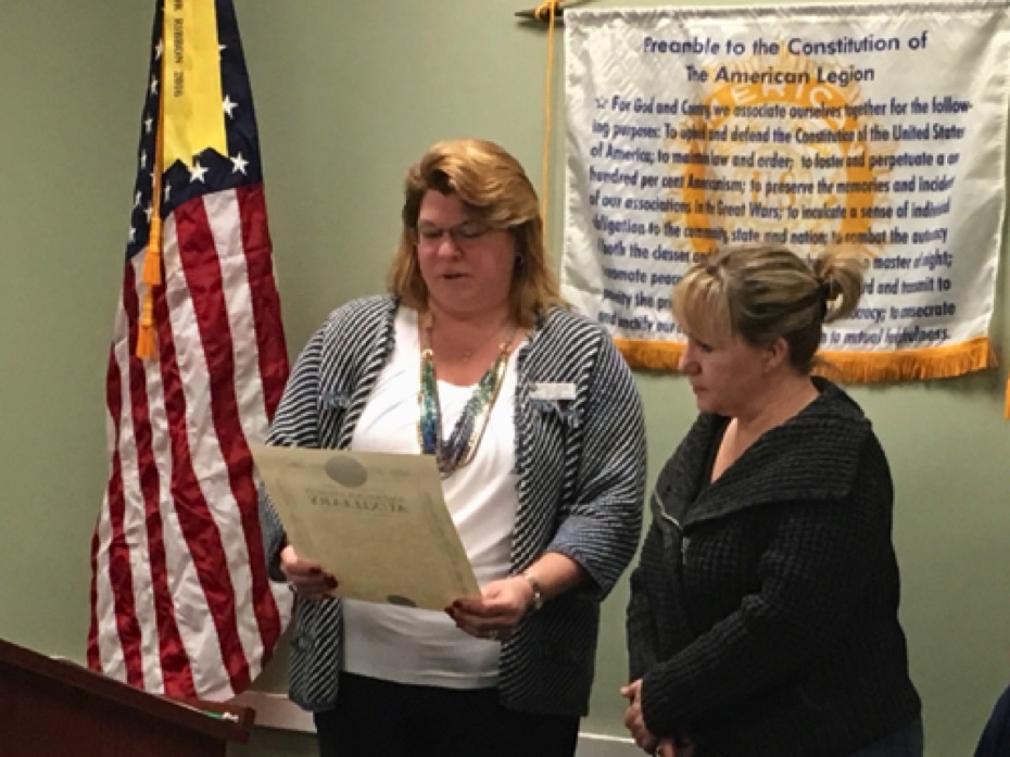 Auxiliary Department Senior Vice President Laura Santino presented the charter to Unit President Karen Strauss.